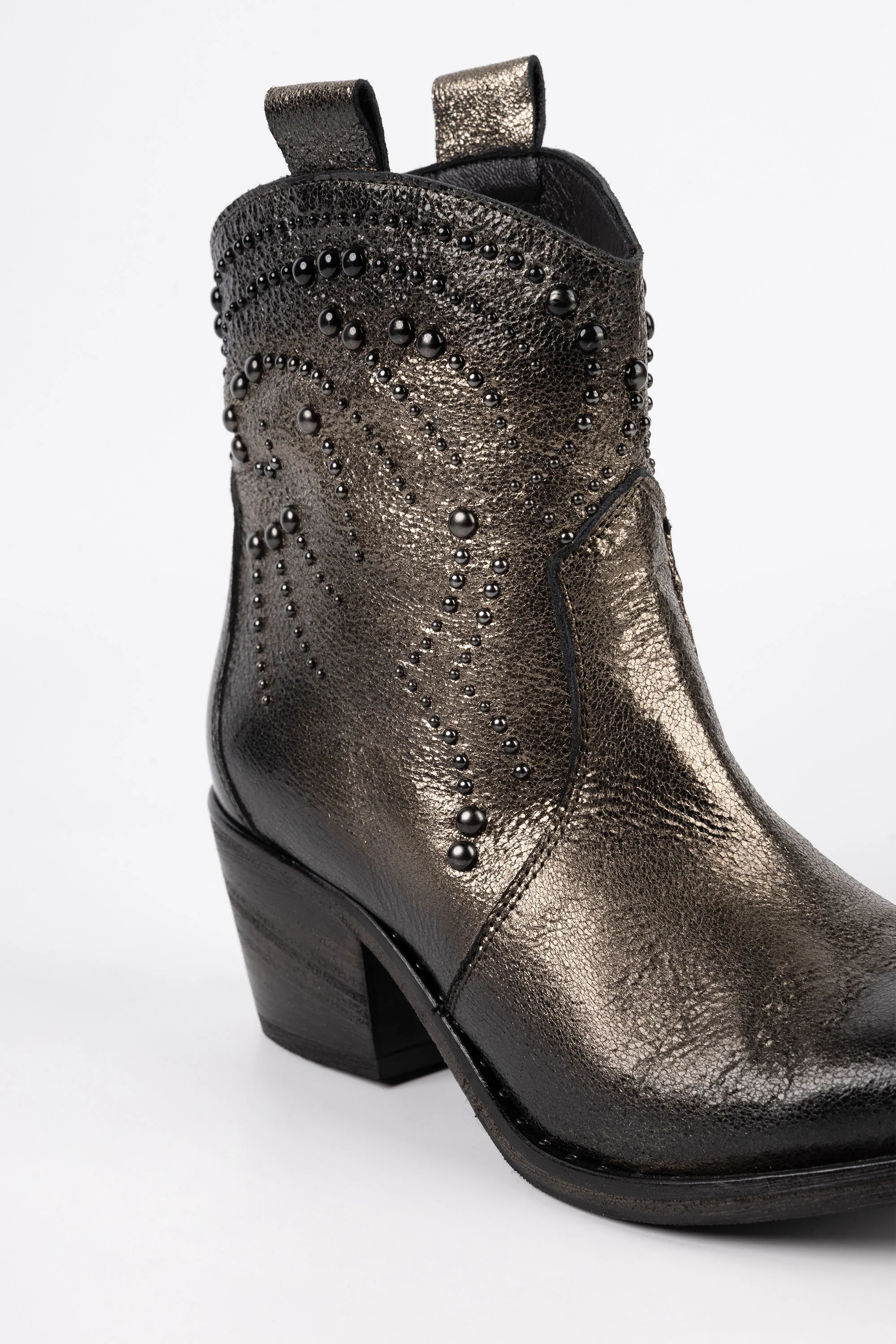 Gli stivaletti Alice in pelle laminata color Evora sono pensati per chi vuole aggiungere un tocco di originalità e luminosità ai propri outfit. La pelle laminata offre una brillantezza particolare che rende questi stivaletti ideali per chi ama distinguersi. I dettagli con borchie completano il look, conferendo un tocco moderno e grintoso.
